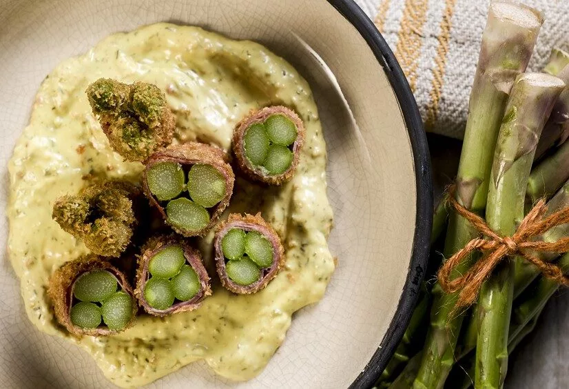 Stap 2 > Rol 3 asperges in een plakje parmaham en laat de aspergekopjes boven de ham uitsteken.