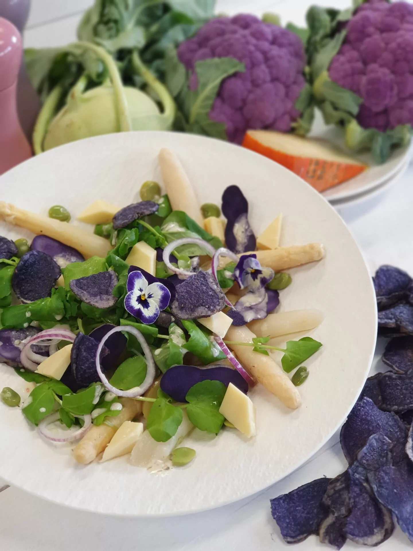 Was de waterkers en de truffelaardappeltjes. Snijd de truffelaardappeltjes met schil in plakjes en blancheer deze. Maak de asperges schoon, snijd in stukken en blancheer ze beetgaar. Maak het mooi op met: waterkers, de truffelaardappeltjes, asperge en stukken van Hollandse kaas. Dresseer de salade met de Dressing Kempische kruiden. Draai er nog wat grof zeezout over en voeg wat truffelchipjes toe voor een krokante bite. Werk het tot slot mooi af met een paars viooltje!