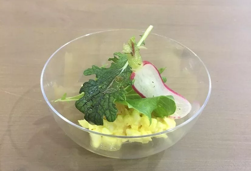 Stap 3 > Vul een glaasje met de salade van bloemkoolrijst. Dresseer hierop de rozijntjes. Leg er vervolgens wat sla op, afgemaakt met Smaakgeheimen dressing Kruiden Honing. Garneer af met wat plakjes radijs (op ijswater).