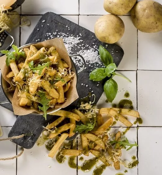 Stap 2 > Verdeel de oerfriet in het bakje of bord. Besprenkel het geheel met de SMAAKgeheimen vinaigrette pesto.