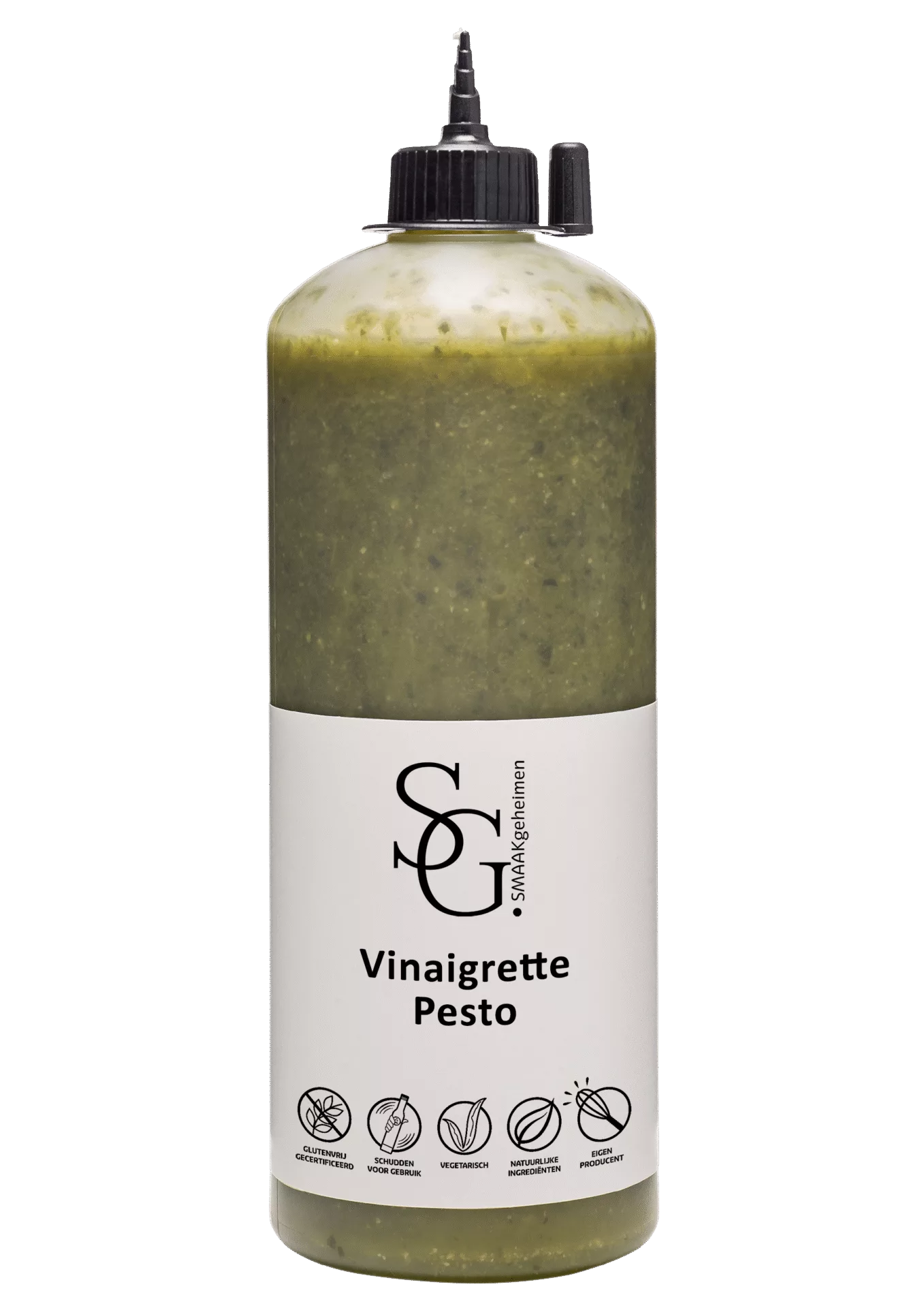 Stap 2 > Besprenkel de zalm met SMAAKgeheimen Vinaigrette pesto zodat deze voor 1/3 deel onder staat. Gaar de zalm rosé in de oven.