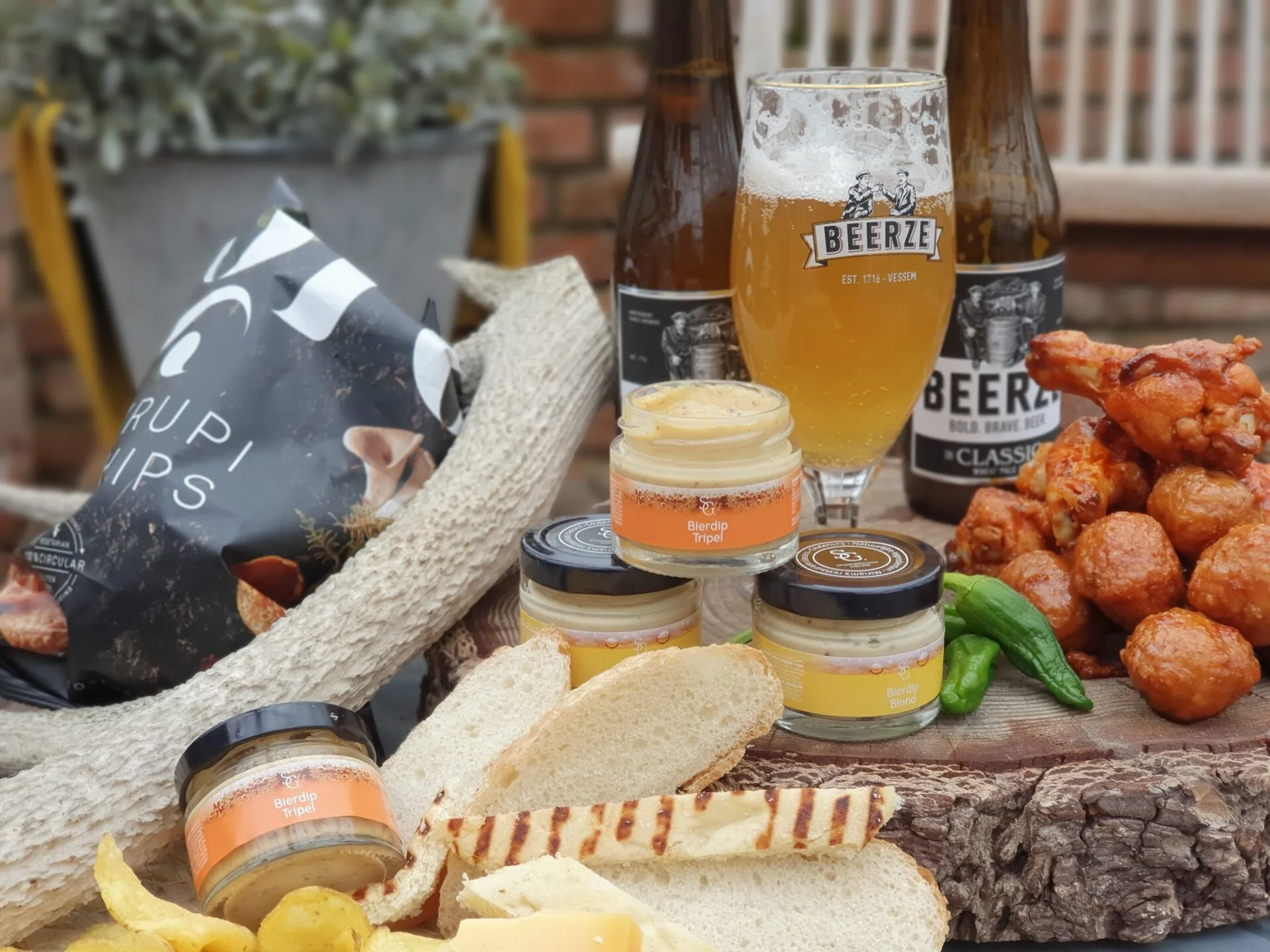 Stap 4 > Plaats de potjes Bierdip Blond en Tripel op de borrelplank. Leg rondom de Bierdip de blokjes kaas, worst, gehaktballetjes, kippenvleugeltjes, brood en chips. Server er een koud biertje bij en de plank is compleet!