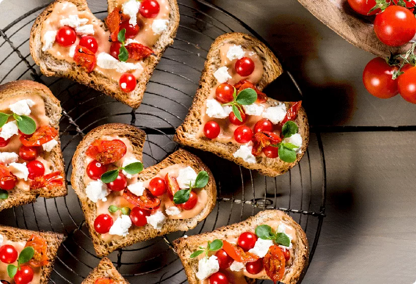 Stap 3 > Smeer op elk broodhart 1 eetlepel Smaakgeheimen Chipdip Cocktail. Verdeel de minitomaatjes over de broodhartjes. Leg er stukjes geitenkaas en de gedroogde cherrytomaatjes tussen. Garneer de crostini met tuinkers of cress.