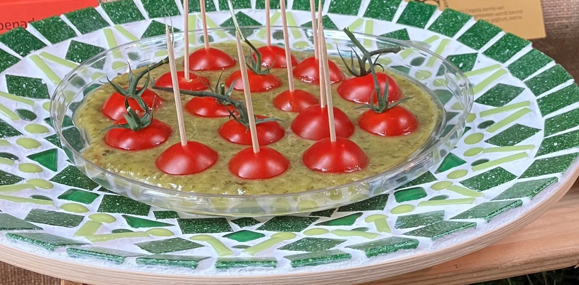 Stap 2 > Halveer de tomaatjes en leg ze in de Pesto Vinaigrette.