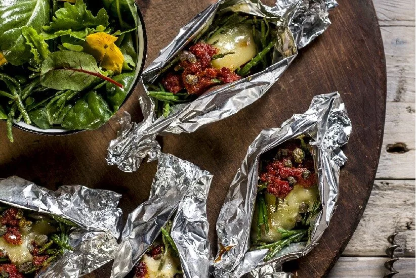 Stap 1 > Verwarm de oven voor op 200˚C. Knip 4 stukken aluminiumfolie van 20×20 cm. Leg een paar takjes zeekraal op elk stuk aluminiumfolie.